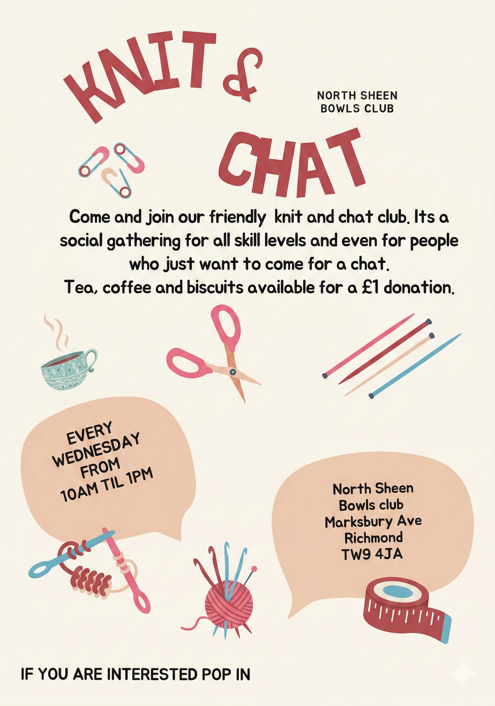 Knit & Chat, Tea/Coffee/Social, 10am till 1pm.
